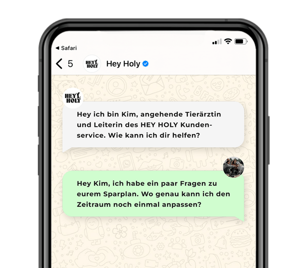 Wir wissen, dass die richtige Futterwahl für deinen Vierbeiner eine vertrauensvolle Entscheidung ist. Deshalb ist unser WhatsApp-Support ist jederzeit für dich da, um all deine Fragen zu beantworten – egal ob du schon Kunde bist oder noch überlegst, ob HEY HOLY das Richtige für deinen Hund ist.