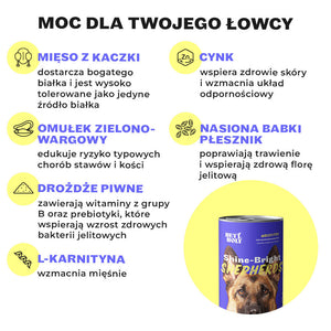 Im Shine-Bright Shepherds Futter verzichten wir bewusst auf die häufigsten Auslöser von Unverträglichkeiten und somit Magen-Darm-Problemen. Unser Futter ist getreidefrei und wir verarbeiten eine einzige tierische Proteinquelle - hochverträgliche Ente. Darüber hinaus verbessern die enthaltene Bierhefe, Flohsamen und Extrakte aus der Yucca schidigera Pflanze die Verdauung und fördern eine gesunde Darmflora.