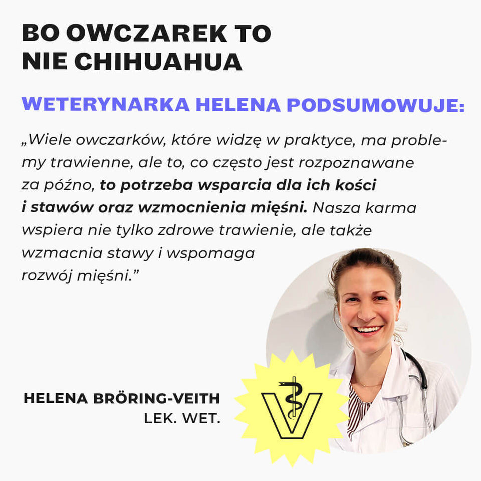 "Als Tierärztin sehe ich täglich Schäferhunde mit Verdauungs- und Gelenkproblemen und denke mir: Warum musste es so weit kommen? Unser Futter mit frischem Entenfleisch unterstützt die Verdauung und fördert gesunde Gelenke – noch bevor die Probleme beginnen."