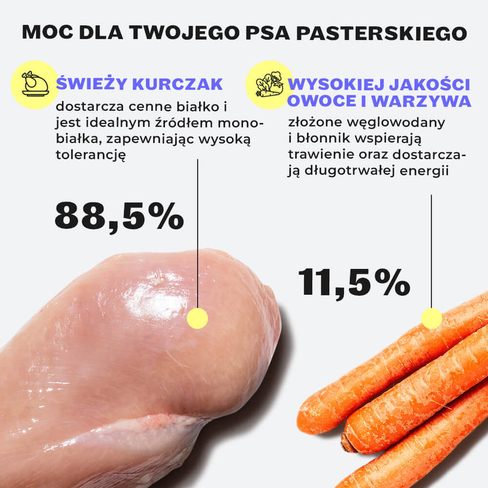 Hühnerfleisch liefert hochwertiges, leicht verdauliches Protein, das perfekt auf die Bedürfnisse aktiver Hütehunde abgestimmt ist