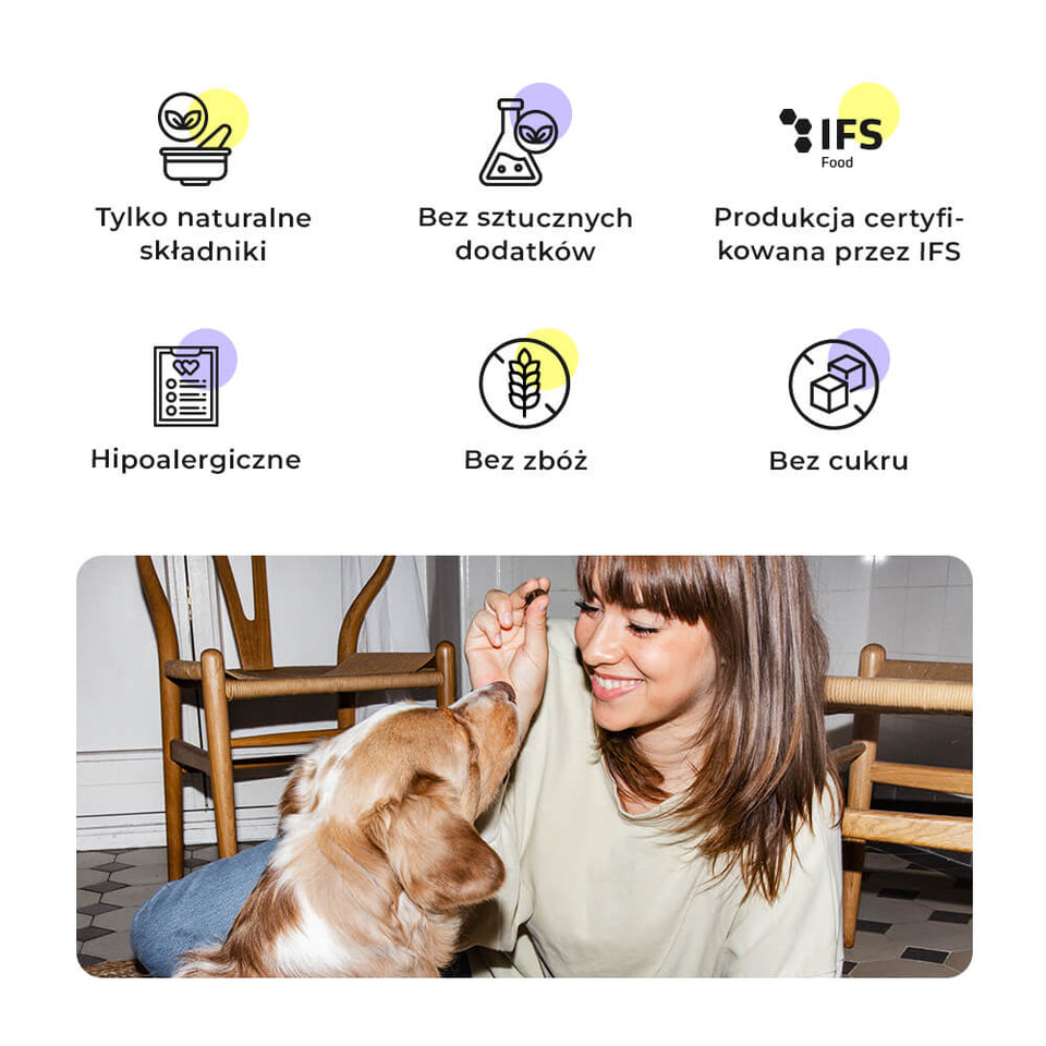 Unsere Snacks sind für Hunde aller Altersklassen geeignet – vom Welpen bis zum Senior. Dank ihrer weichen Konsistenz lassen sie sich leicht kauen und in kleinere Stücke brechen, was sie ideal für Trainingseinheiten oder als kleine Belohnung zwischendurch macht. Besonders profitieren Hunde mit empfindlichem Magen oder Unverträglichkeiten, da unsere Snacks getreidefrei sind und nur eine einzige tierische Proteinquelle enthalten.
