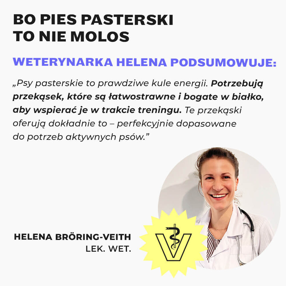 "Hütehunde sind ständig in Bewegung und brauchen hochwertige Energiequellen. Diese Snacks mit 98% Fleischanteil sind perfekt für aktive Hunde – ideal als Belohnung beim Training oder für zwischendurch."