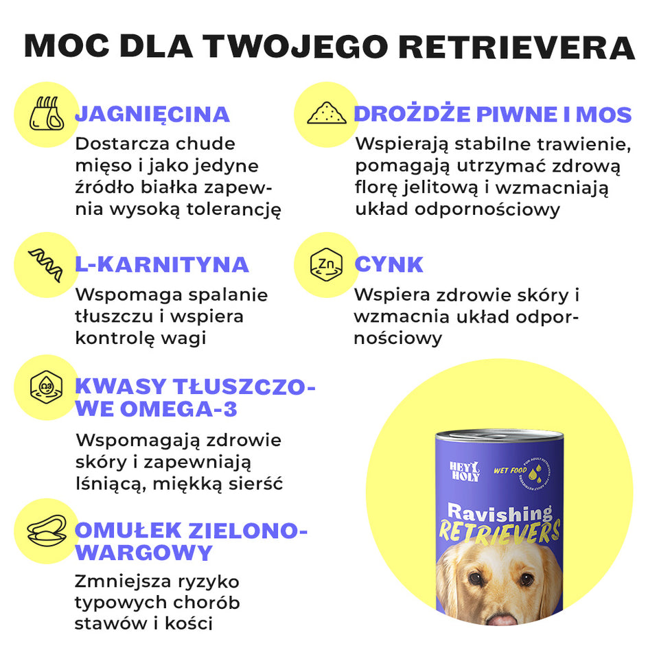 Finis les problèmes de digestion, les démangeaisons ou l'obésité ! Cette pâtée spécialement conçue pour les retrievers apporte aux Golden Retrievers, Labradors & Cie. des protéines d'agneau de qualité supérieure et des micronutriments essentiels - pour une vie de chien active et saine.