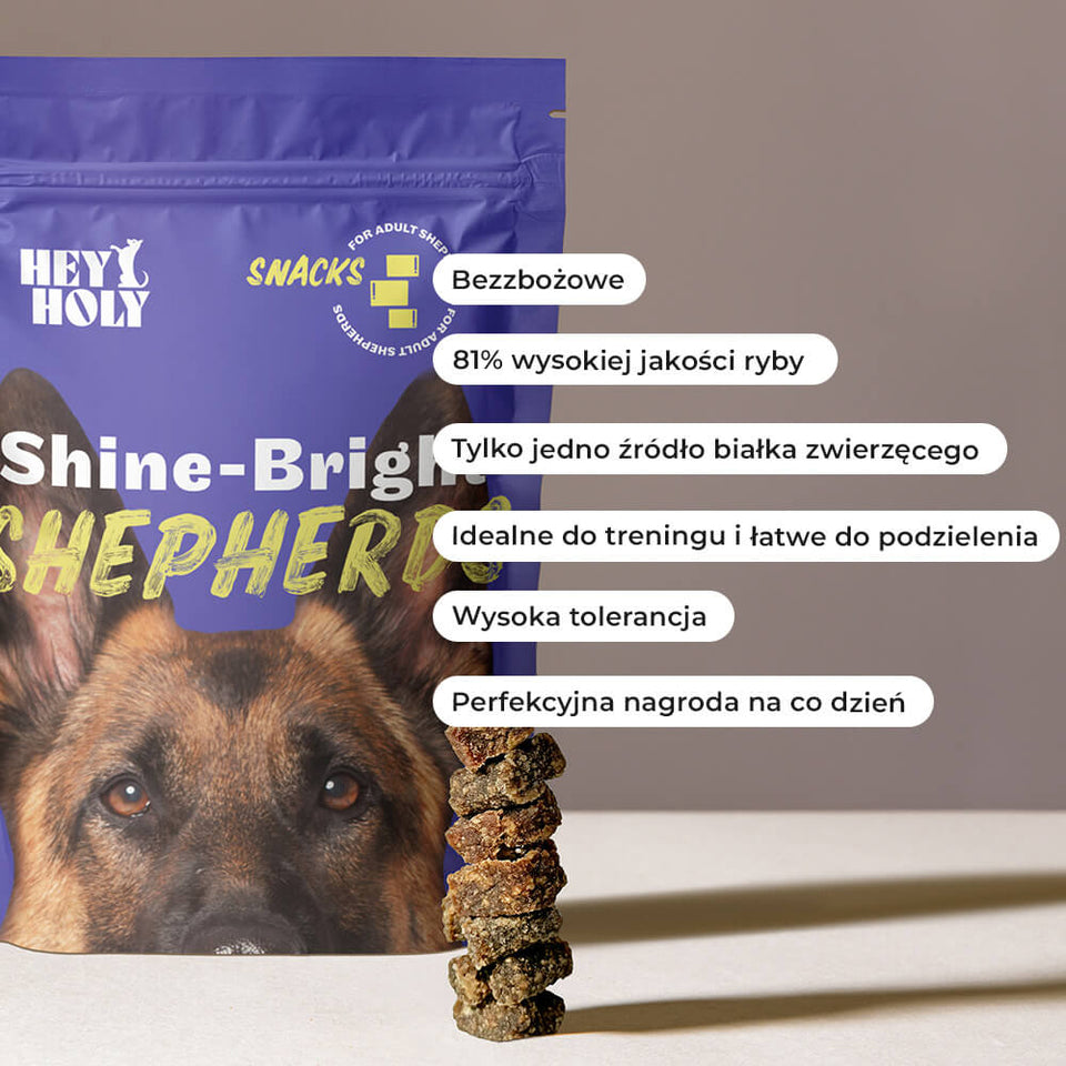 Le complément parfait ! Nos snacks Shine-Bright-Shepherd sont le complément idéal à notre gamme de nourriture Shine-Bright-Shepherd. Avec 81% de viande de canard comme seule source de protéines, ils sont particulièrement savoureux et bien tolérés. Que ce soit pendant l’entraînement ou comme petite récompense entre deux, ces snacks sans céréales s’intègrent parfaitement dans le quotidien de votre Berger Allemand.