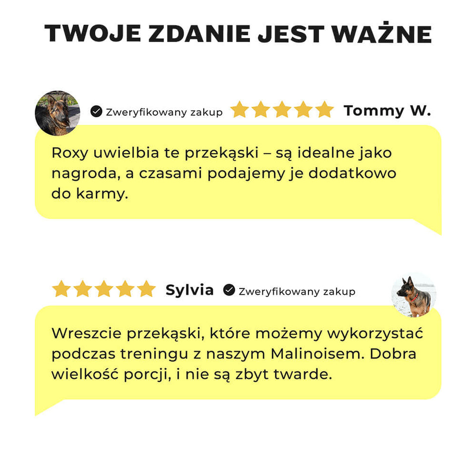Nos snacks sont principalement composés de viande et peuvent être facilement brisés en petits morceaux si nécessaire. Ils sont donc adaptés à l’entraînement, mais peuvent également être utilisés comme récompense au quotidien.
