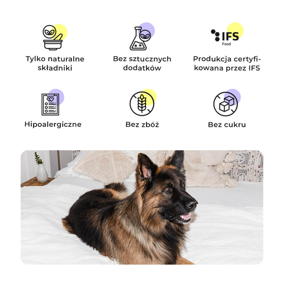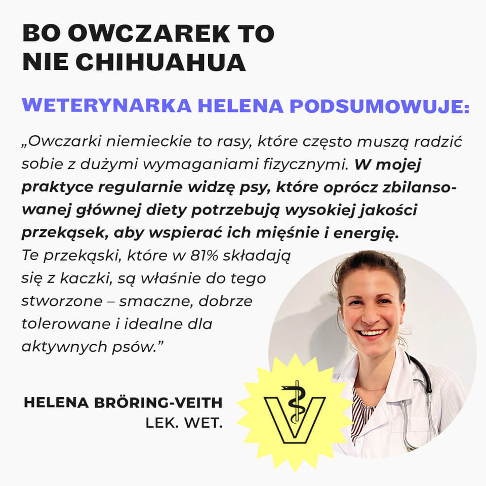 « Les bergers allemands font partie des races de chiens les plus actives et ont des besoins énergétiques élevés. Ces snacks avec 81% de viande de canard sont parfaitement adaptés à leurs besoins - comme récompense de qualité pendant l’entraînement ou tout simplement entre les repas. »