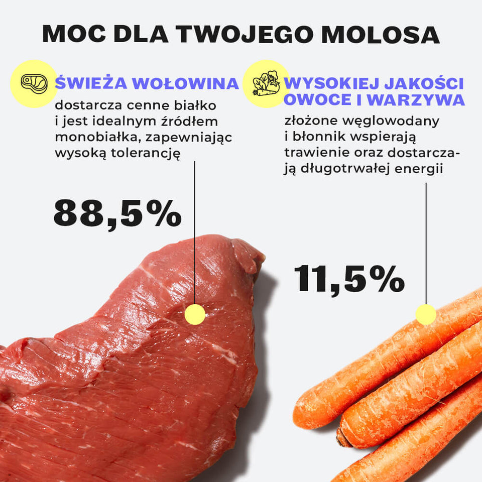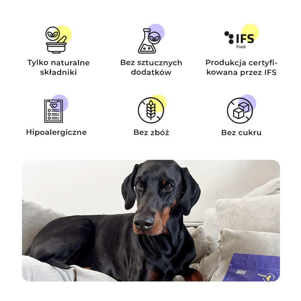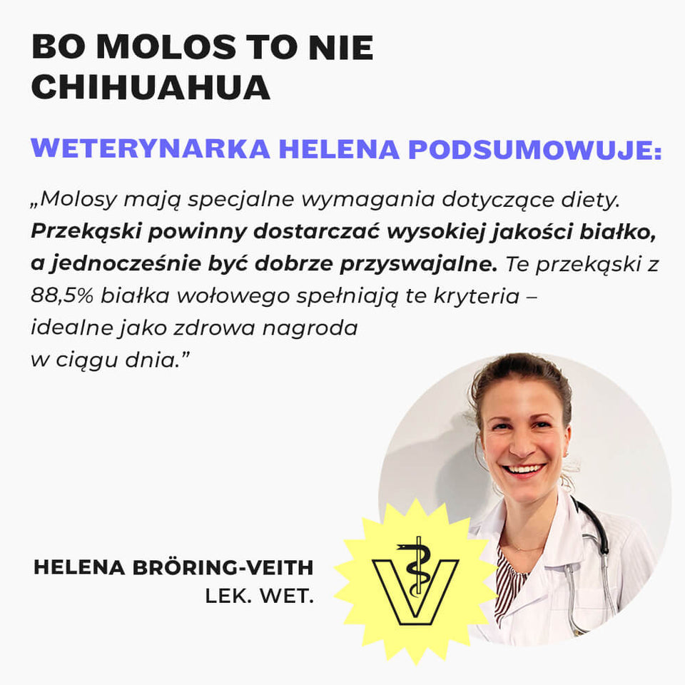 "Les molosses comme les rottweilers ou les bouviers bernois ont non seulement besoin de beaucoup d'énergie, mais aussi de protéines de haute qualité. Ces snacks contenant 88,5% de protéines de bœuf sont parfaits pour les récompenser de temps en temps - sans faire de compromis sur un régime alimentaire de qualité".
