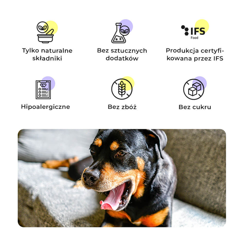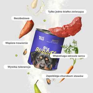 Dans la nourriture Big Buddies, nous renonçons délibérément aux déclencheurs les plus fréquents d'intolérances et donc de problèmes gastro-intestinaux. Notre nourriture ne contient pas de céréales et nous utilisons une seule source de protéines animales - du bœuf hautement toléré. De plus, la levure de bière qu'elle contient améliore la digestion et favorise une flore intestinale saine.