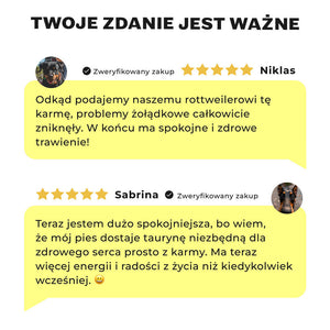 "J'ai toujours été un peu sceptique à propos des aliments purement sans céréales, car j'ai entendu dire que cela pouvait entraîner une carence en taurine. Mais HEY HOLY Big Buddies m'a complètement convaincu : c'est non seulement sans céréales, mais contient également de la taurine supplémentaire - parfait pour Bruno (Rottweiler, 5 ans) et Bella (Doberman, 3 ans). Les deux chiens adorent la nourriture, leur digestion est excellente et je remarque à quel point ils sont en forme. Nous allons certainement continuer!"
