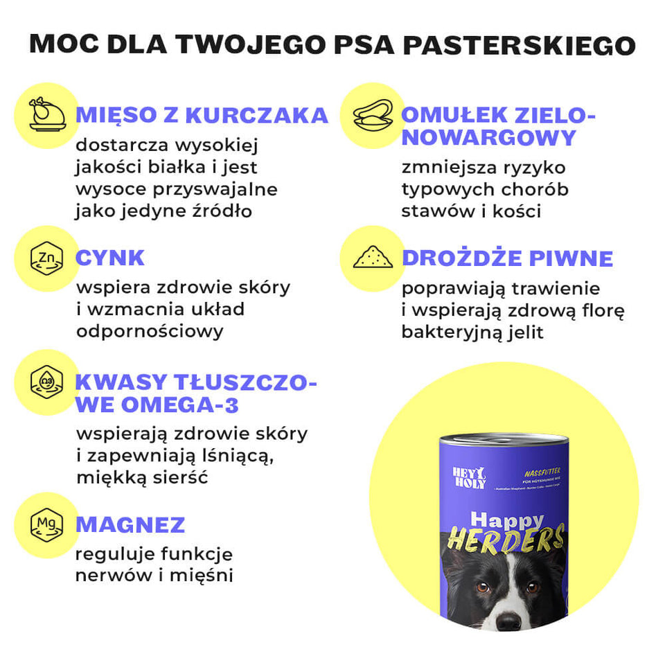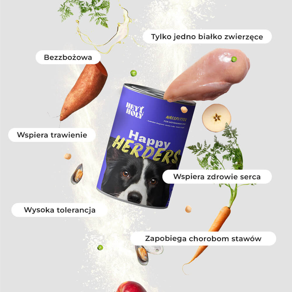 Dans la nourriture Happy Herders, nous évitons délibérément les déclencheurs les plus fréquents d'intolérances et donc de problèmes gastro-intestinaux. Notre nourriture est sans céréales et nous utilisons une seule source de protéines animales - du poulet hautement digeste. De plus, la levure de bière qu'elle contient améliore la digestion et favorise une flore intestinale saine.