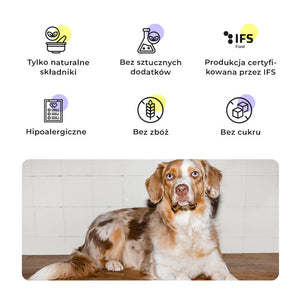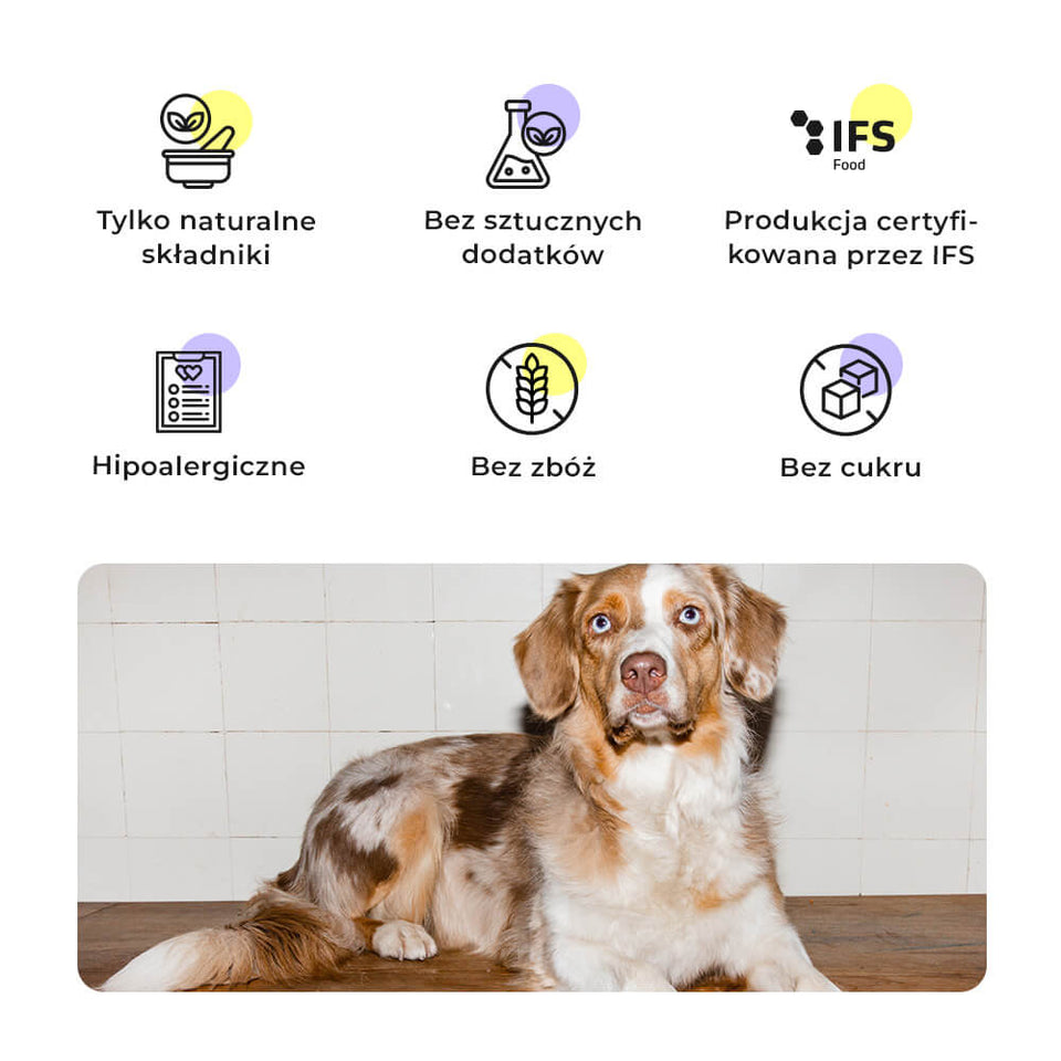 « Les chiens de berger comme les bergers australiens ont souvent des problèmes digestifs et articulaires qui peuvent s'aggraver au fil du temps. Avec notre recette spéciale à base de viande de poulet facile à digérer et de micronutriments, nous renforcons non seulement les articulations, mais également le système immunitaire et le système nerveux ».