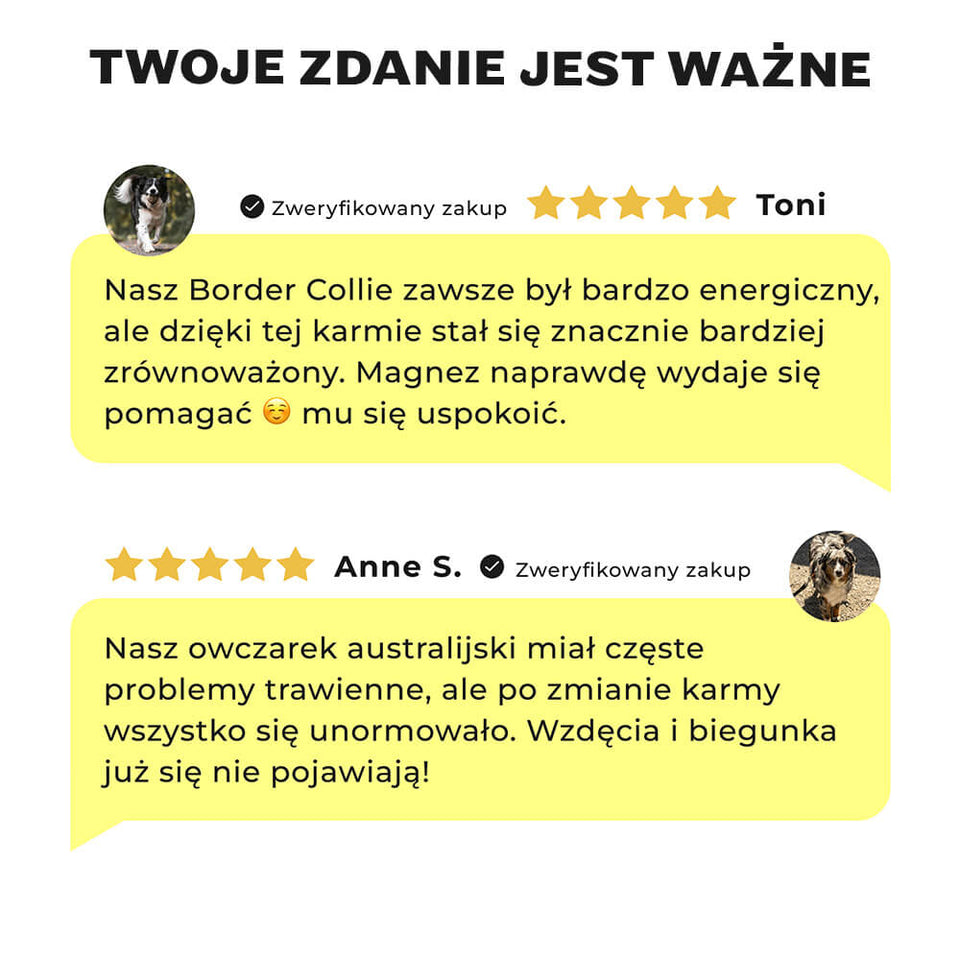 "Notre collie Finn avait des problèmes digestifs depuis longtemps, avait souvent des selles molles et parfois des flatulences. Depuis qu'il est passé à HEY HOLY Happy Herders, c'est du passé. Ses selles sont à nouveau plus fermes et il semble beaucoup plus équilibré et énergique. Nous aimons aussi à quel point sa fourrure est devenue douce et soignée. La nourriture parfaite pour nous!"
