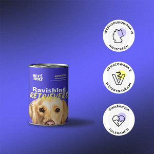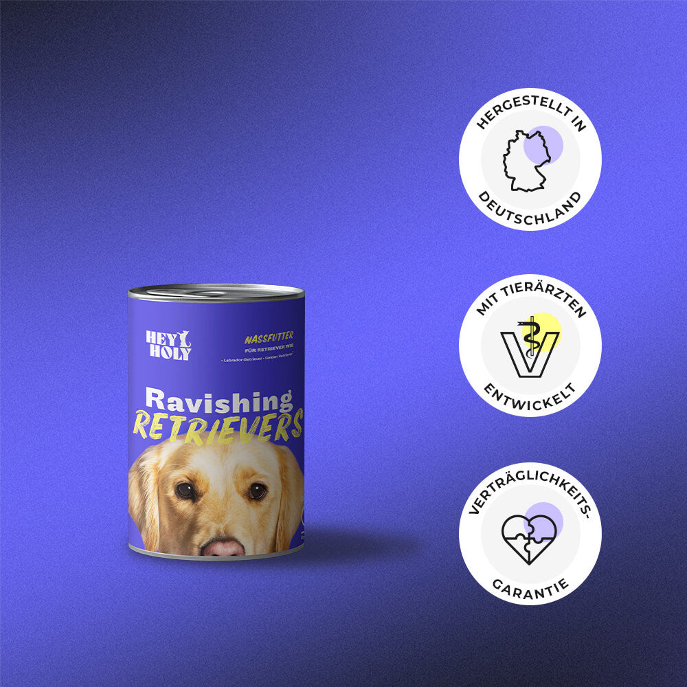 Les croquettes Ravishing Retrievers sont spécialement développées pour les races de retrievers, comme le Golden Retriever, le Labrador, mais aussi les races de retrievers mixtes. Notre nourriture est adaptée aux chiens adultes.