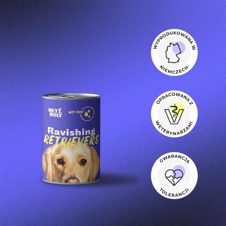 Ravishing Retrievers jest specjalnie opracowana dla ras z grupy retriever, takich jak golden retriever, labrador oraz mieszanych retrieverów (kundelków, u których przeważa rasa retriever). To karma dla dorosłych psów, więc jest odpowiednia dla wszystkich w pełni rozwiniętych czworonogów.