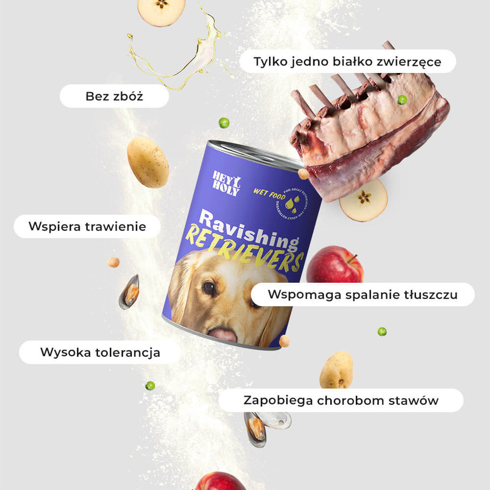 Wysoka zawartość białka i umiarkowana zawartość tłuszczu w jagnięcinie jest idealna dla retrieverów i jako jedyne źródło białka zapobiega nietolerancjom.